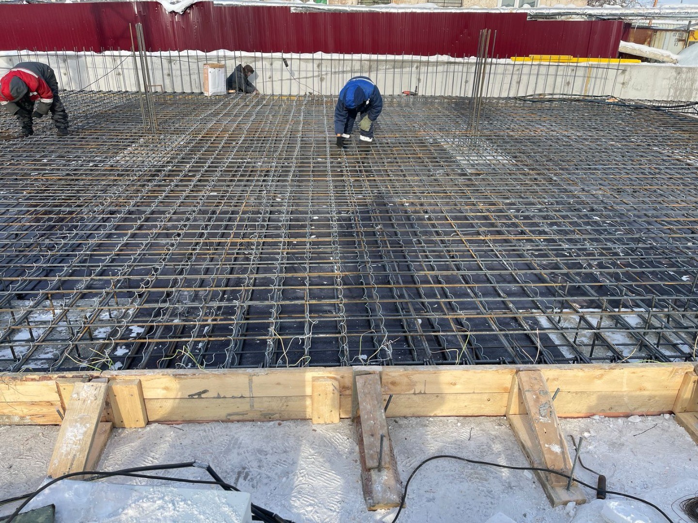 - Продолжаются работы по армированию и устройству опалубки цокольной плиты стилобатной части (также с электропрогревом).
